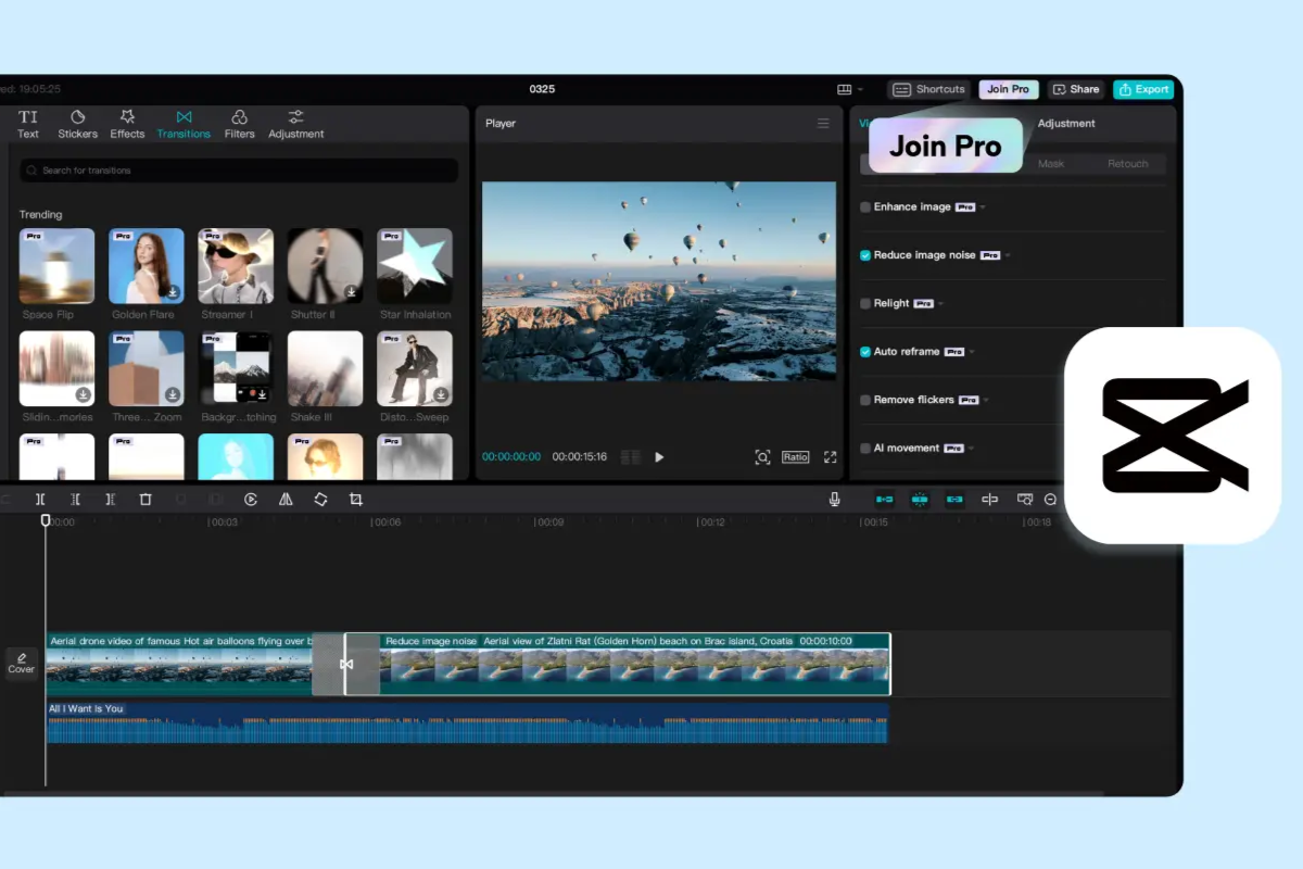 - Tối ưu âm thanh: CapCut AI tự động cân bằng âm thanh, giảm tạp âm, đồng thời đồng bộ nhạc nền với nhịp chuyển cảnh, mang đến trải nghiệm xem video hoàn hảo.