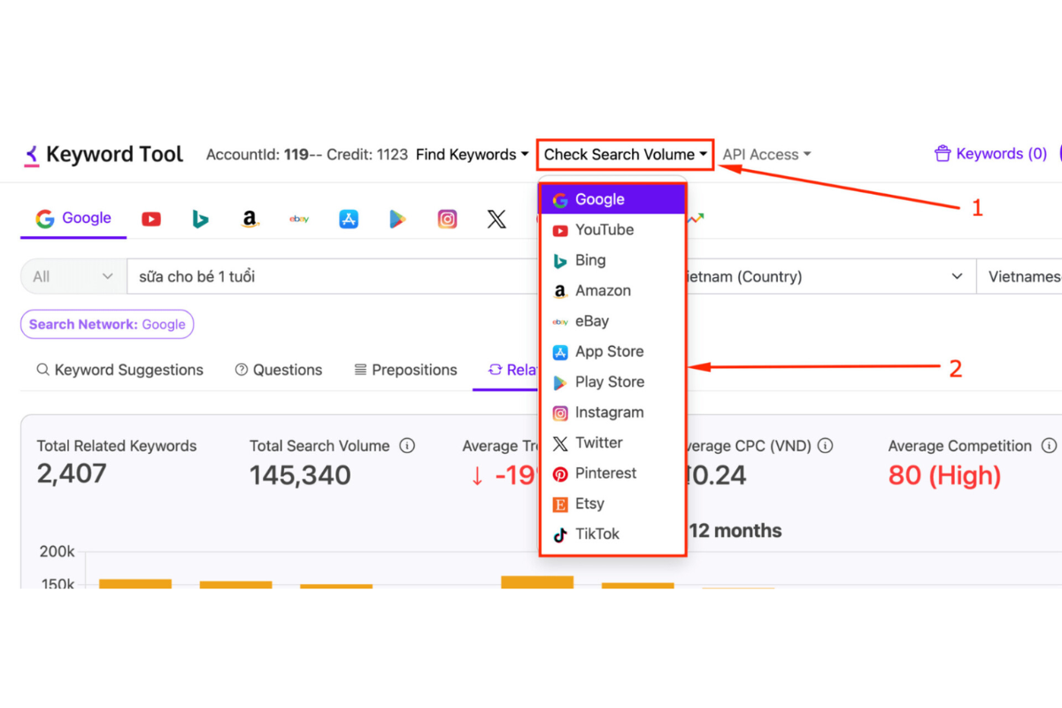 Ví dụ: Nếu bạn đang bán sản phẩm “phần mềm quản lý công việc”, bạn có thể nghiên cứu từ khóa ở cả thị trường Việt Nam và Mỹ. Kết quả sẽ hiển thị rõ: